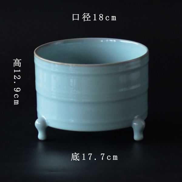 樽高12.9厘米,口径18厘米,足径17.8厘米。樽直口、圆筒腹、平底,由三个变形兽足支撑。樽外壁上中下凸起七道弦纹,中部三道,近口及底部各有两道。器物制作庄重古朴,气韵高雅,上中下三层七道弦纹,更增加了三足樽庄重肃穆之感。胎质细腻,呈香灰色,胎体较轻。里外满釉,呈天青色微泛蓝,并有细小浅白的开片,俗称冰裂片。色质柔和莹润,造型完美和谐。