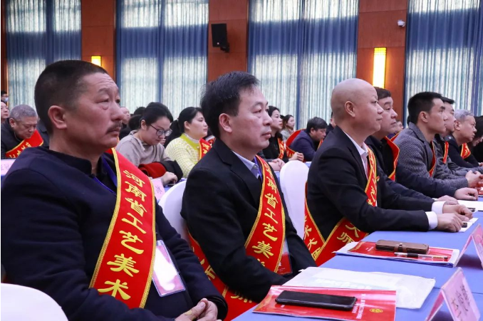 2月24日上午,第八届河南省工艺美术大师颁证暨自律培训会议在登封市河南省招生考试学术交流中心召开。河南省工业和信息化厅总工程师、一级巡视员姚延岭,消费品工业处处长寇守峰,河南省工艺美术行业协会会长孔红生参加会议。会议由工信厅副处长曹西峰主持。五至七届部分中国工艺美术大师(河南)、第八届中国工艺美术大师、第八届河南省工艺美术大师等200余人参加了本次会议。